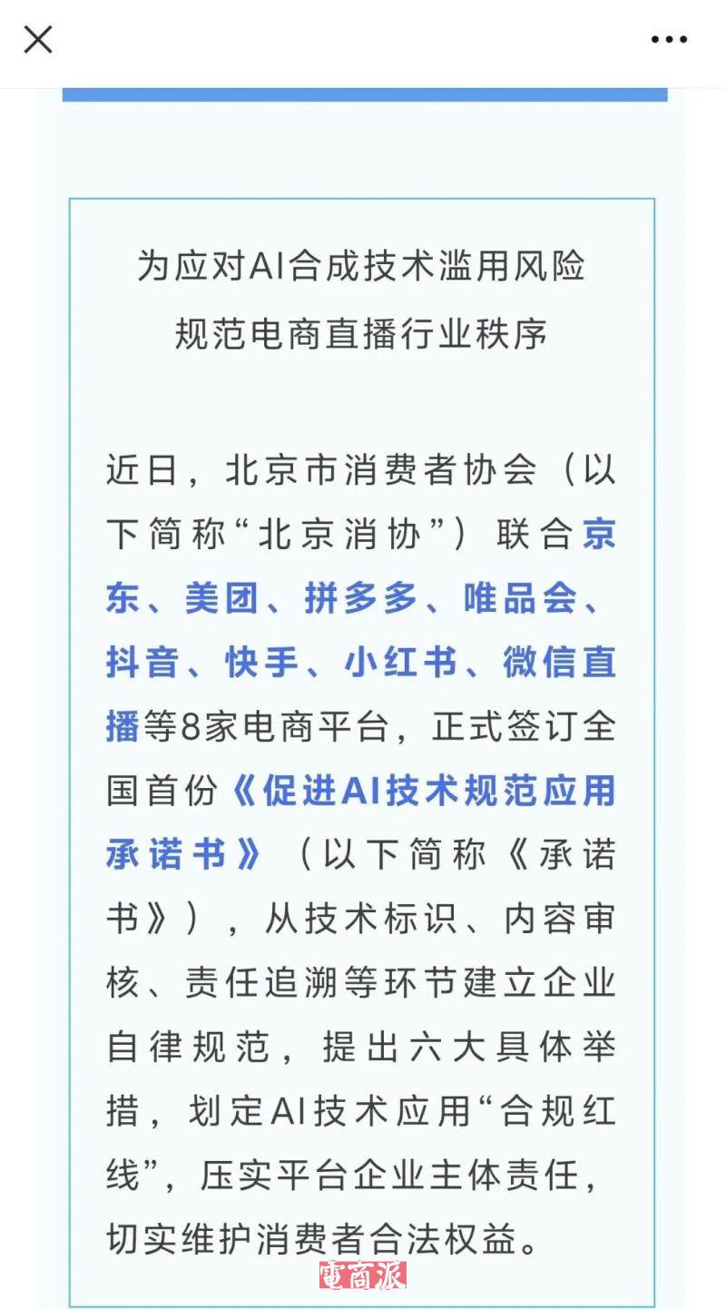 为了打击这类AI技术滥用乱象, 北京市消费者协会 联合 京东 、 美团 、 拼多多 等八大电商平台,正式签订全国首份《促进AI技术规范应用承诺书》(下称承诺书)。