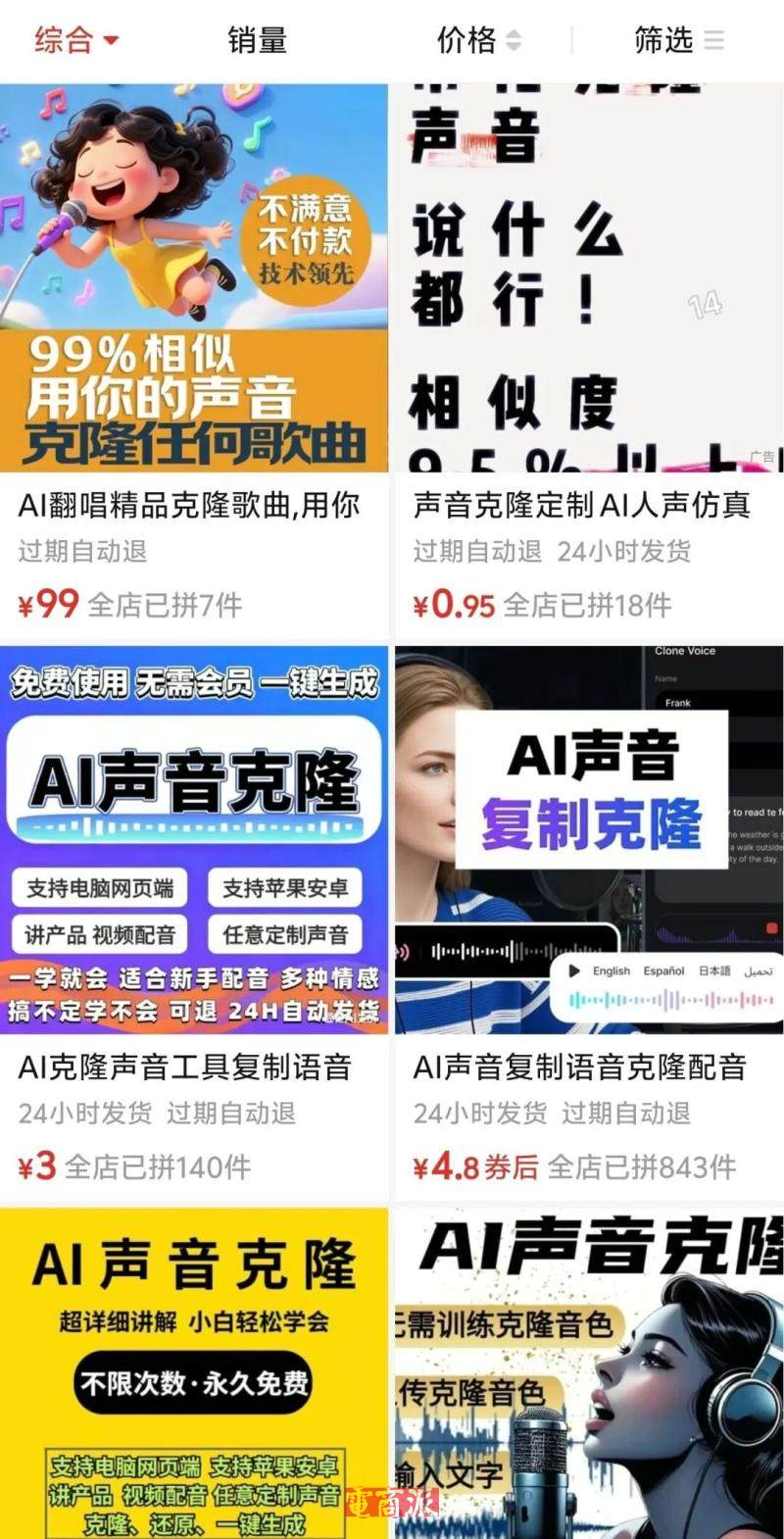 在电商平台上,AI 声音克隆工具的售卖明目张胆,几块钱到数百元的教程比比皆是。