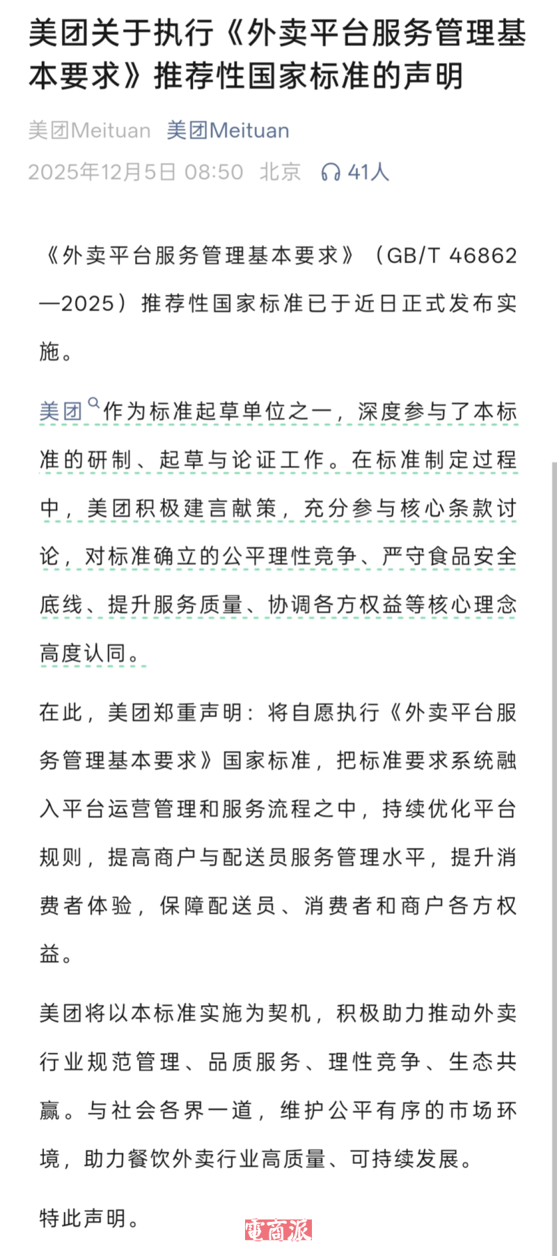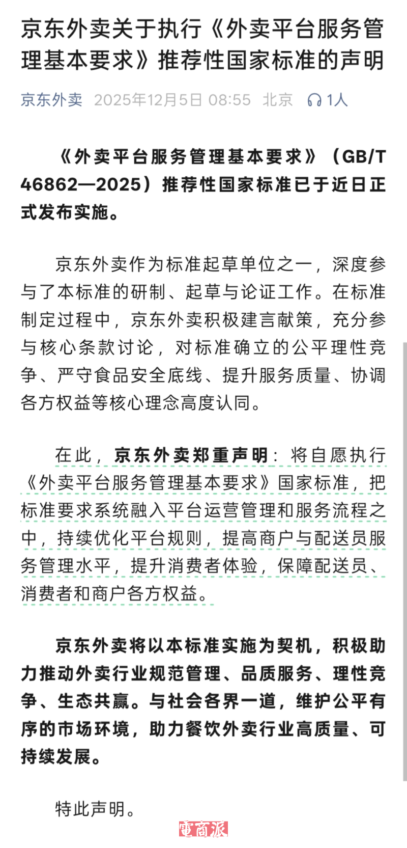 对此, 美团 、 京东 、 淘宝 闪购集体发文表示,将自愿执行《外卖平台服务管理基本要求》国家标准,把标准要求系统融入平台运营管理和服务流程之中,持续优化平台规则,提高商户与配送员服务管理水平,提升消费者体验,保障配送员、消费者和商户各方权益。