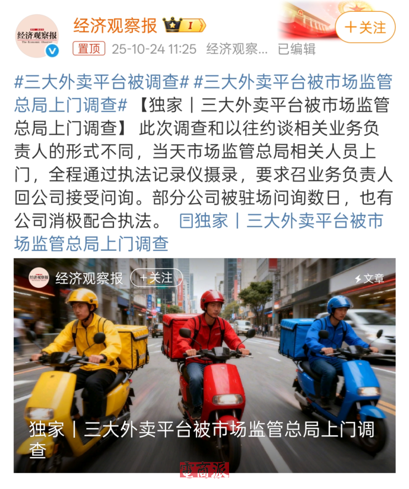 图源:央视新闻微博  此外,据经济观察报消息,10月中旬, 京东 、 美团 、饿了么还在同一天被 国家市场监督管理总局 上门调查,调查涉及食品安全,以及外卖平台对商家经营资质审核等问题。
