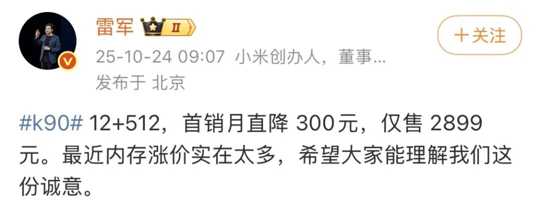 雷军早在10月底回应红米K90首销定价时就已经无奈表示“最近内存涨价实在太多了”,而卢伟冰则在上周小米三季度业绩会上表示,尽管小米已经与合作伙伴签订了2026年全年供应协议,但不排除未来可能通过涨价和产品结构升级来平滑成本压力。
