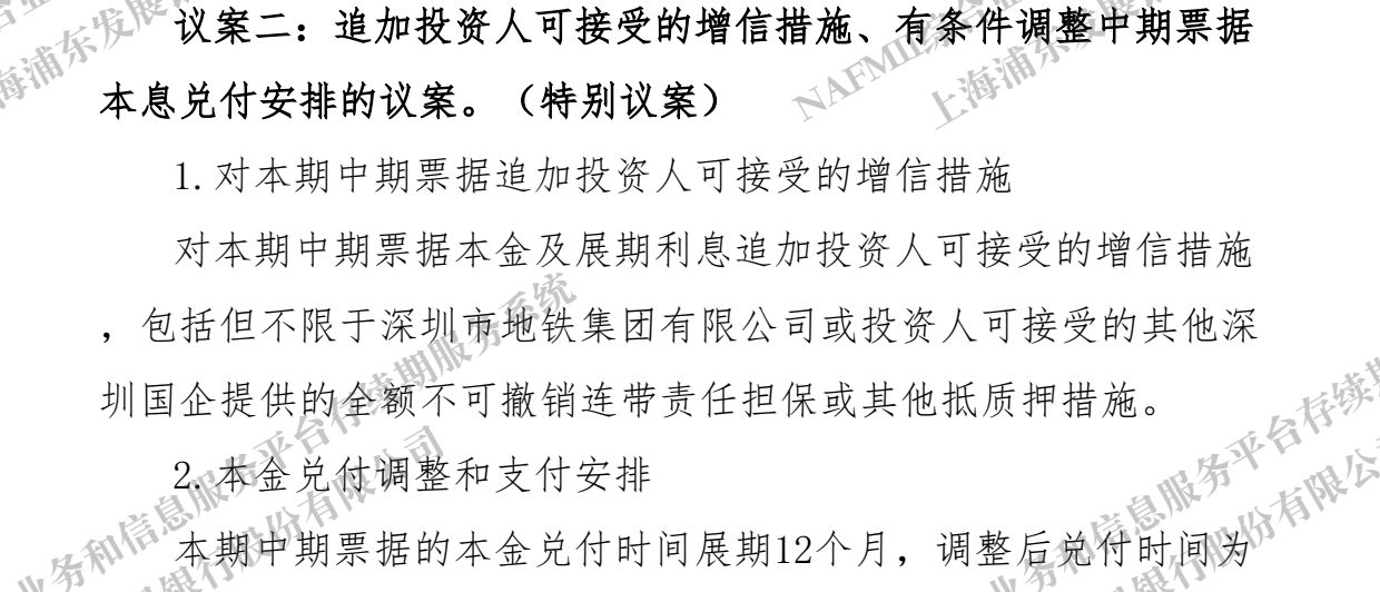 其中,议案二明确了增信措施的核心方向:对本期中期票据本金及展期利息追加投资人可接受的增信措施,包括但不限于 深圳市地铁集团有限公司 或投资人可接受的其他深圳国企提供的全额不可撤销连带责任担保或其他抵质押措施。此外,议案还约定, 万科 在偿付后续到期债券前,需优先兑付本期票据本息。