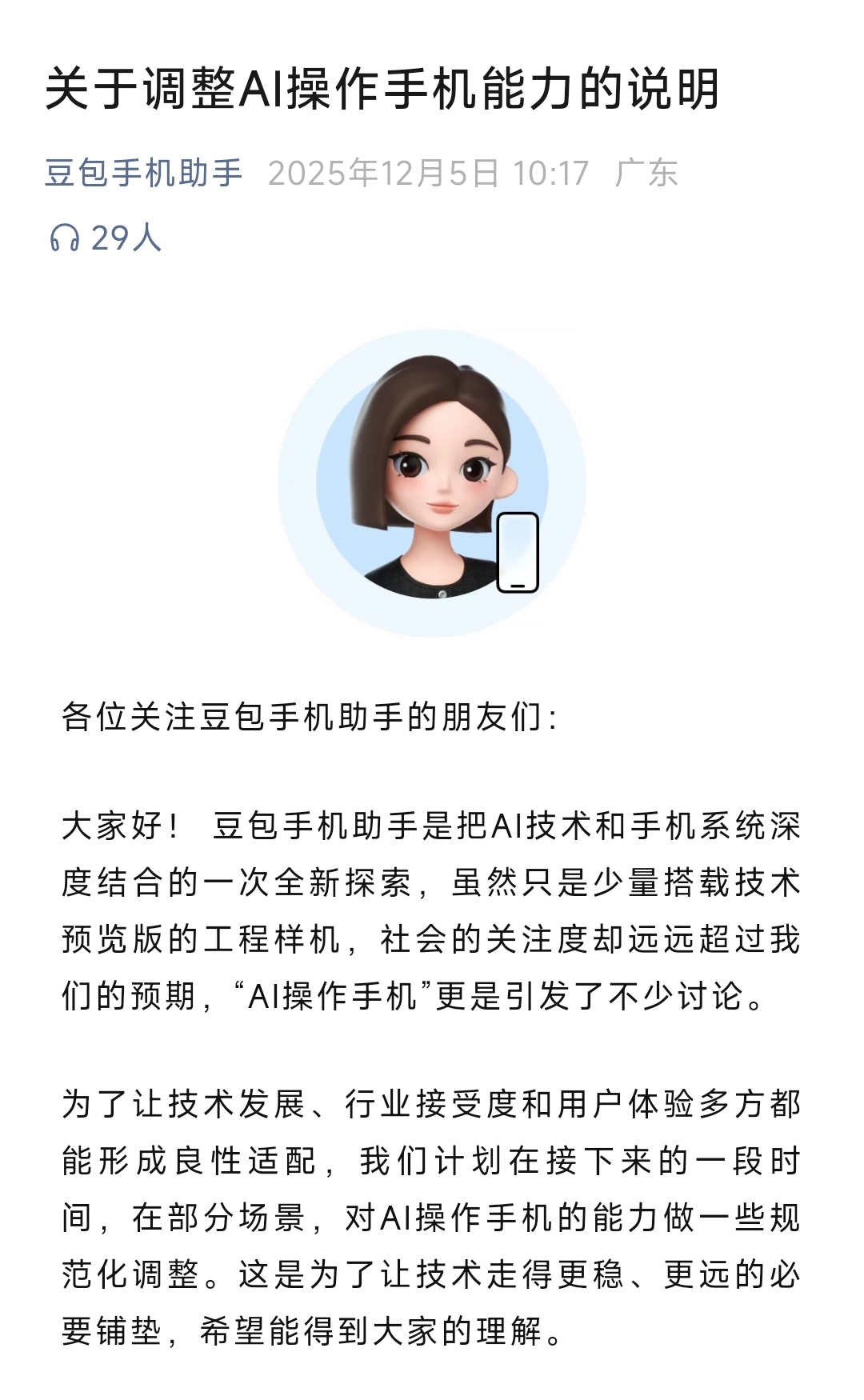 最近“用户认知一般,但是在行业内群情激昂”的“大事”,无疑是中兴旗下努比亚手机搭载豆包助手所引发的行业热议,围绕行业关心的问题,在12月5日,豆包手机助手对外发布《关于调整AI操作手机能力的说明》(以下简称《说明》),对近期行业内关注的限制刷分、刷激励的使用场景;进一步限制金融类应用的使用和限制部分游戏类使用场景三个问题做出了包括但不限于的规则化调整。
