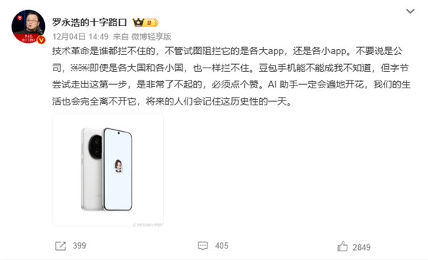 是罗永浩也发文称,技术革命是谁都拦不住的,不管试图阻拦它的是各大APP,还是各小APP。不要说是公司,即使是各大国和各小国,也一样拦不住。其还表示,“豆包手机能不能成我不知道,但字节尝试走出这第一步,是非常了不起的,必须点个赞。AI助手一定会遍地开花,我们的生活也会完全离不开它,将来的人们会记住这历史性的一天。”