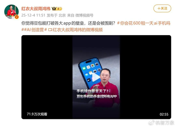 不过,目前对于该机的评价也是两极分化,毕竟对于普通消费者而言,要把自己的各种账号密码都交付给一款手机来控制,还是需要有一定勇气的。同时,对于该机,业内大咖的评价也是大相径庭。其中,周鸿祎就表示,手机操作要变天了,字节不造手机,却要抢走所有手机的灵魂。最近豆包手机助手一出来,美团淘宝的高管们可能要连夜开会了。