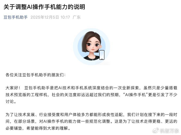另外,日前,豆包手机助手团队正式发布《关于调整AI操作手机能力的说明》,宣布为了让技术发展、行业接受度和用户体验多方都能形成良性适配,计划将在接下来的一段时间,在部分场景,对AI操作手机的能力做一些规范化调整。豆包手机助手指出,此举是为了让技术走得更稳、更远的必要铺垫。