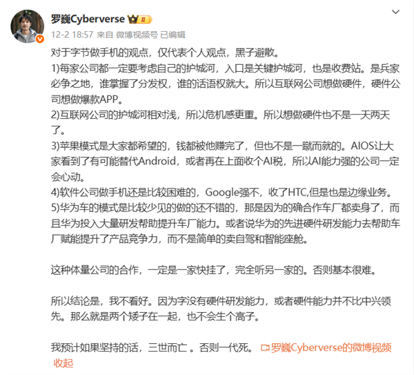 荣耀首席影像工程师@罗巍Cyberverse 则直言“对于字节做手机的观点,仅代表个人观点,黑子避散。