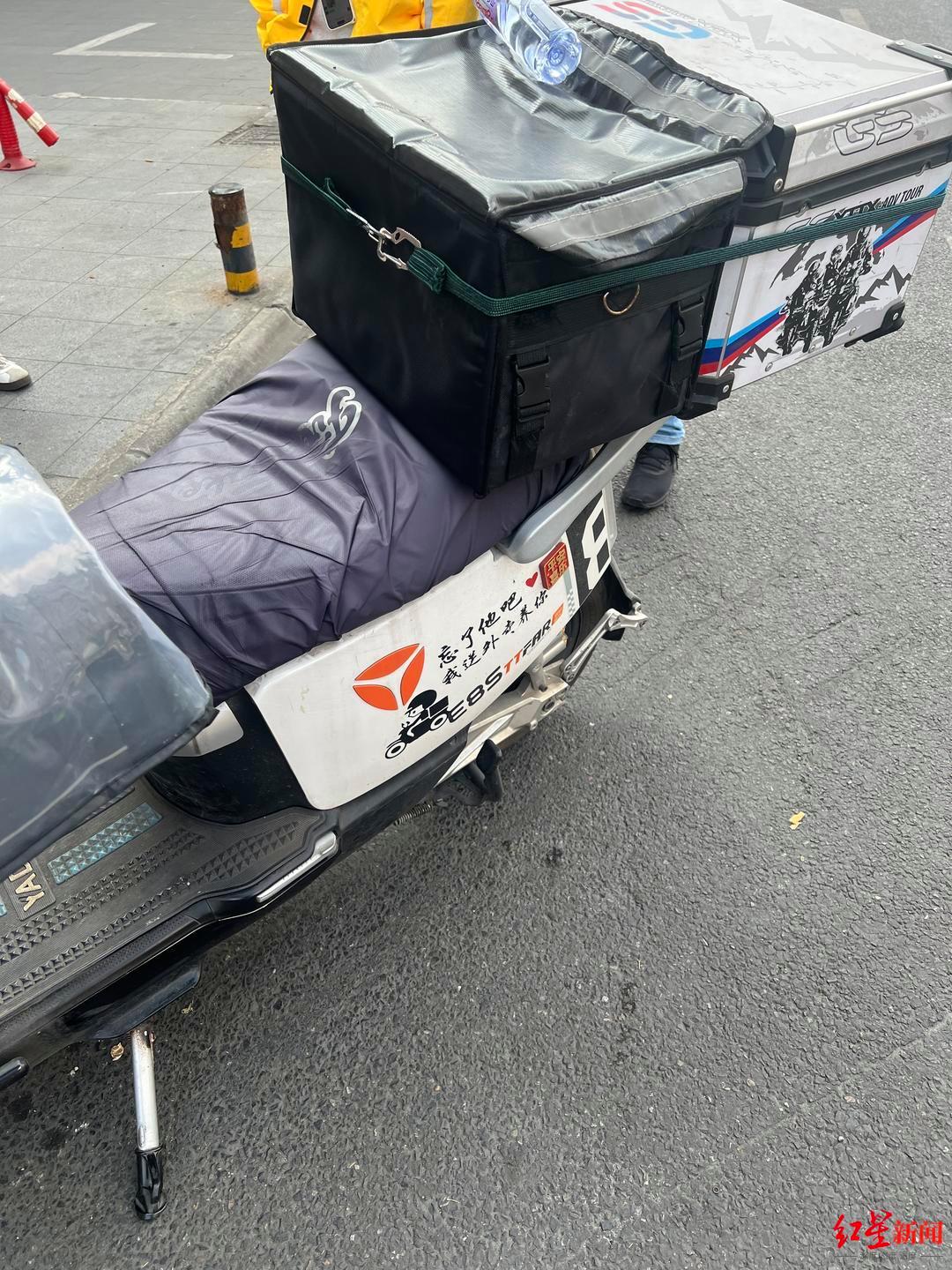 老冉的电动车上贴着很多贴纸,有318进藏旅游路线图,一个红色的“平安喜乐”贴纸,还有一句“忘了他吧,我送外卖养你。”