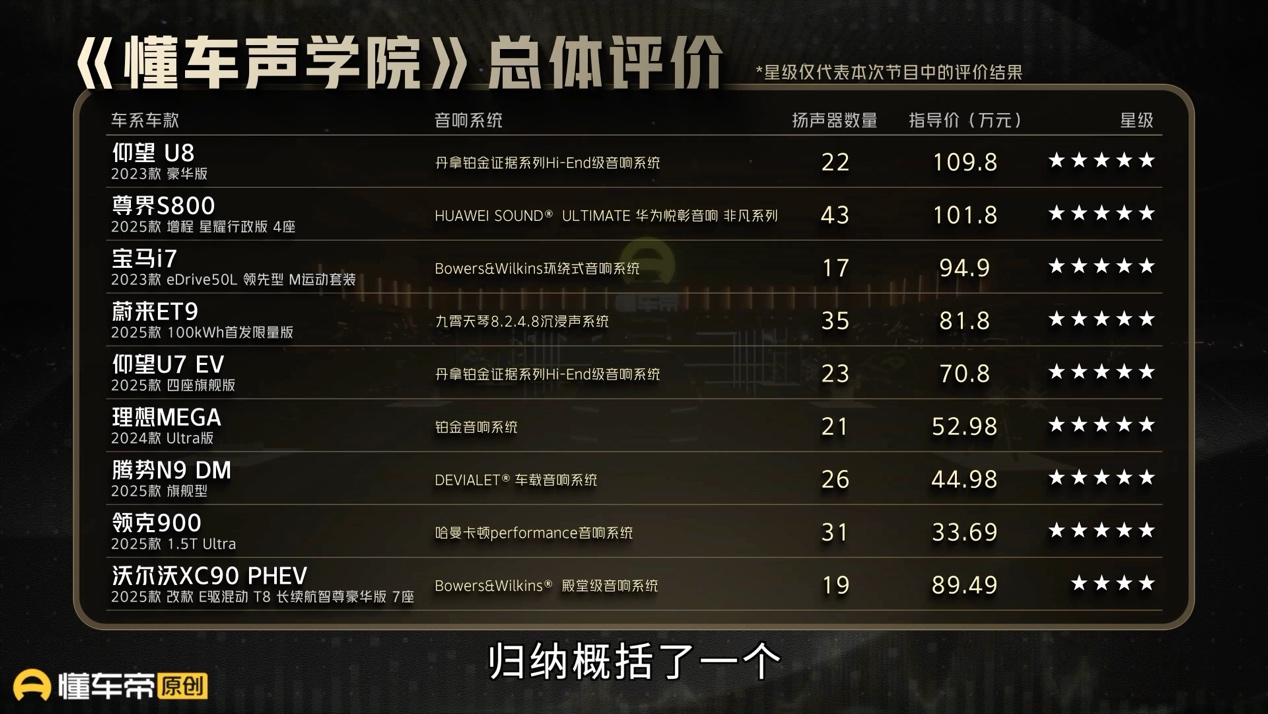 据介绍,本节目选取当前市场主流热销、关注度高的50款车型,联合权威测试机构和国内知名音乐制作人,构建客观数据采集与主观体验的全维度评价体系,覆盖合资、海外豪华及自主品牌主流车型,全面反映不同品牌车型的声学性能水平。节目针对车辆行驶噪音、静态隔音、AI试听评价和主观听觉等多个维度进行试验,并综合多维评价数据,给予1-5星等不同等级的综合评价。