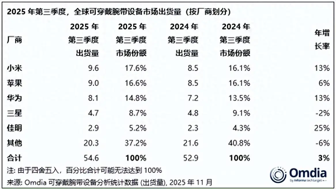 今天分享的是2025年Q3全球可穿戴设备出货量,出货量达到了5460万台,同比增长3%。比较意外的是市场价值,同比增长为12%,达到了123亿美元,看来消费者越来越喜欢更高端的可穿戴设备了。在榜单排名方面,小米打败了苹果排名第一,国产厂商真的越来越强势了。