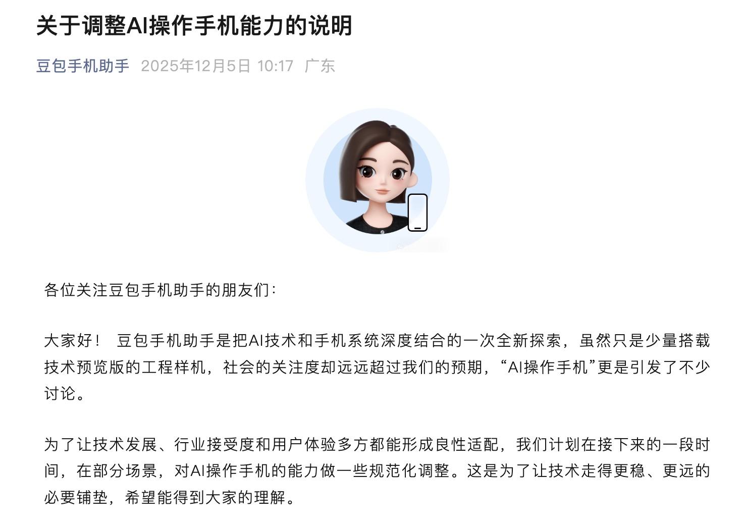 为了平息“AI操作手机”的质疑, 豆包 手机助手于12月5日再发声明,称将进一步限制部分使用场景——包括限制刷分、刷奖励,部分游戏类使用场景,暂时下线操作银行、互联网支付等金融类应用的能力。同时表示,正在积极寻求与各应用厂商的深度沟通,希望推动形成更加清晰、可预期的规则。