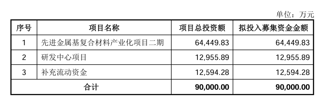 本次有研复材拟募资9亿元,分别用于先进金属基复合材料产业化项目二期、研发中心项目、补充流动资金。