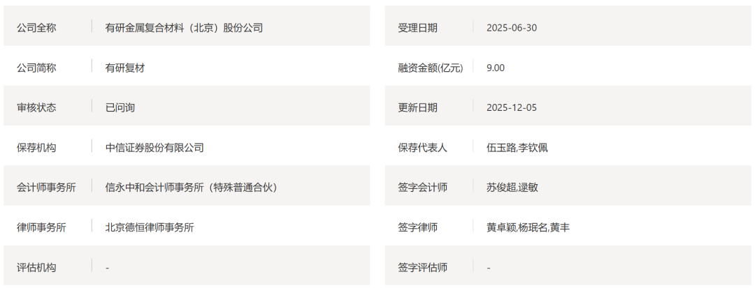 12月5日,据上交所官网,有研金属复合材料(北京)股份公司(下称“有研复材”)披露上会稿。上海证券交易所上市审核委员会定于2025年12月12日召开2025年第63次上市审核委员会审议会议,审议有研复材(首发)。