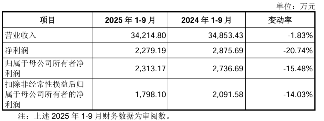 2025年1~9月,公司实现营业收入3.42亿元,同比减少1.83%;归母净利润为2313.17万元,同比减少15.48%;扣非归母净利润为1798.10万元,同比减少14.03%。