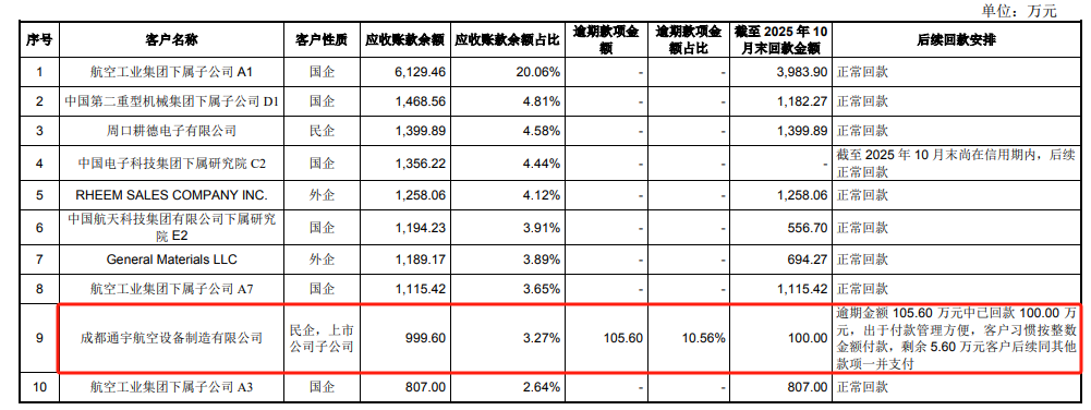 有研复材在二轮问询中回应称,除成都通宇外,公司前十大应收账款客户主要为国企及国内外知名民企,经营情况较好,不存在较大回款风险。