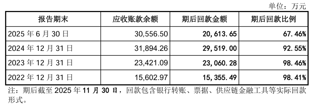 公司应收账款余额的期后回款比例分别为98.40%、98.34%、86.40%和42.77%,2025年6月末应收账款回款相对较低。