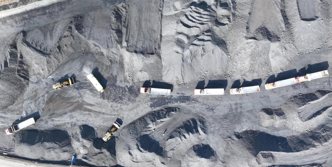 地上,黄家山露天煤矿,200多台挖机铲车不停作业,一车车煤炭运出大山;