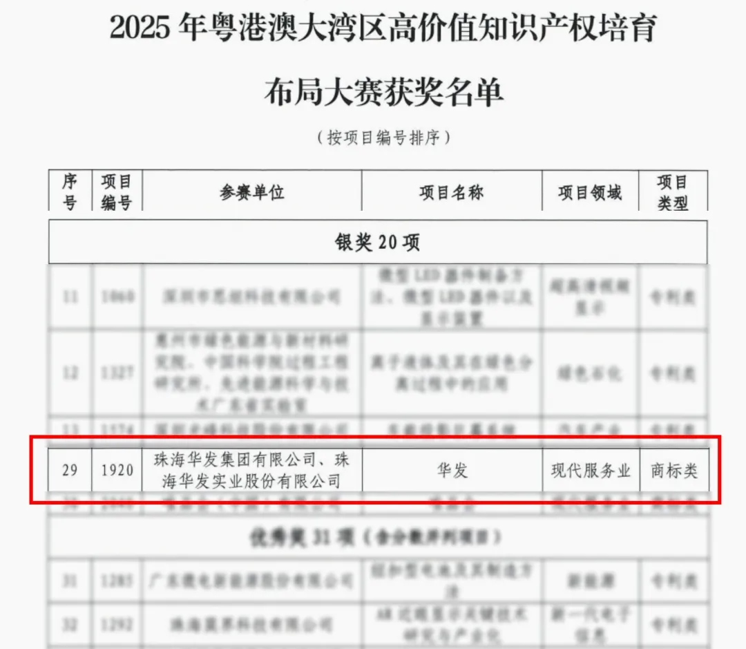 近日,在2025年粤港澳大湾区高价值知识产权培育布局大赛(以下简称“湾高赛”)决赛中,华发集团凭借多年来卓越的品牌价值培育和突出的商标管理实践,获专家评委高度认可,从上百家知名企业中脱颖而出,荣获大赛银奖。