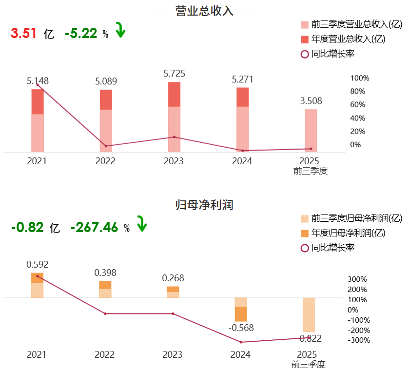 2025年1-9月,公司营业总收入3.51亿元,同比下降5.22%;归母净利润为-8223.92万元,同比下降267.46%。经营性净现金流为-5,685.54万元。