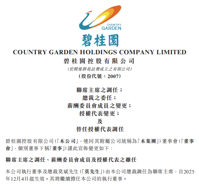 碧桂园 管理层迎来结构性调整。58岁的莫斌自2010年7月起担任公司总裁,在 碧桂园 工作了超过13年。此次调任联 席主席 后,他将不再负责日常运营管理,转而协助董事会主席进行战略规划及资源整合。