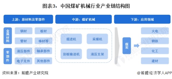 从煤矿机械行业产业链上下游来看,煤矿机械行业上游主要包括原材料及零部件,其中金属材料包括钢材、板材、管材、棒材等,零部件主要包括液压部件、轴承部件、电子元件以及其他部件等;煤矿机械的中游主要是煤炭综合采掘设备制造,包括掘进机、采煤机、刮板输送机、液压支架制造等;下游应用领域主要为煤炭行业,进一步用于火电、钢铁、化工、建材等领域。