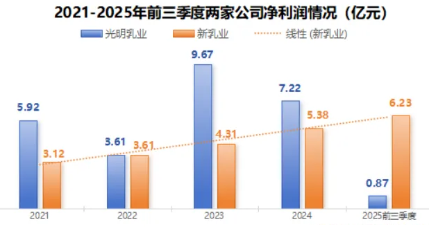 曾经与 伊利 、蒙牛齐名的 光明乳业 ,正遭遇严峻挑战。2025年前三季度,其净利润不足新乳业七分之一,单季度甚至出现亏损。而成立不足二十年的新乳业,以超20%的年均净利润增速迅猛上位。这场洗牌背后,不仅是企业排位的更迭,更折射出中国乳业从常温主导到低温鲜奶崛起的关键转型。老牌企业何以陷入区域困局?新势力又如何凭借供应链革新与精准并购实现弯道超车?这场关于“守成”与“破局”的较量,正重新划定乳业江湖的势力版图。