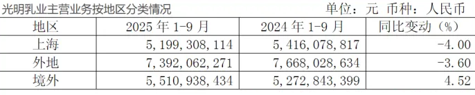 光明乳业 的业绩滑坡,并非一日之寒。作为从上海成长起来的乳业“老字号”,光明长期深度依赖华东市场,形成了“强区域、弱全国”的布局。2025年前三季度,其上海大本营营收同比下滑4%,其他国内区域市场也下降3.6%。这种过度集中的市场结构,在行业风向转变时显得尤为脆弱。