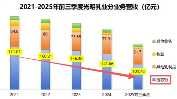 昔日的优势,如今成了包袱。光明早年凭借巴氏杀菌技术和送奶入户模式,在华东市场成功树立了“新鲜”的品牌认知。但当消费者普遍转向追求低温鲜奶,且全国冷链物流与即时零售网络日臻完善时,低温奶的销售半径被极大扩展。光明却受制于全国性渠道建设的滞后,难以将区域优势转化为全国胜势。其核心液态奶业务连续多年萎缩,2025年前三季度营收同比再降8.57%,直接拖累整体利润。