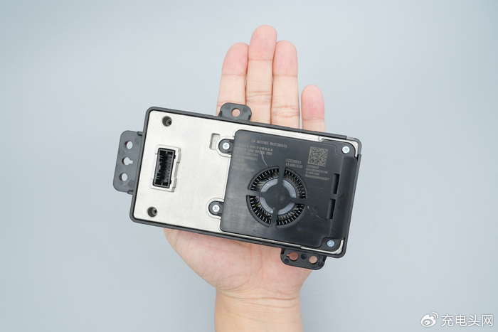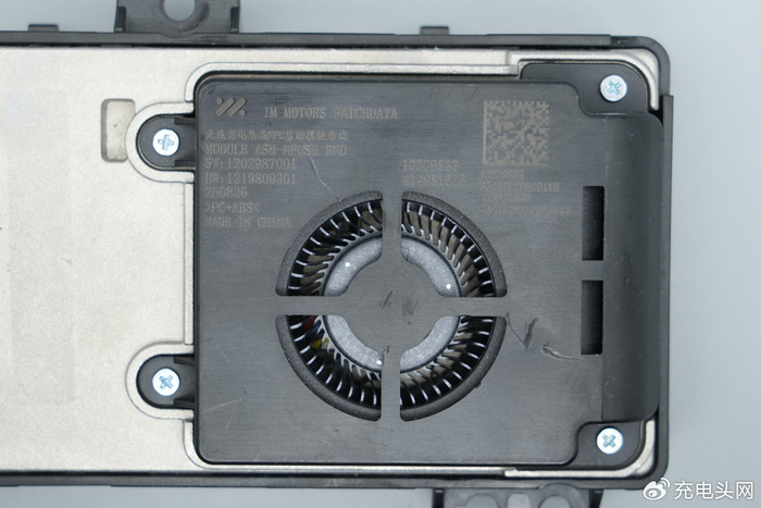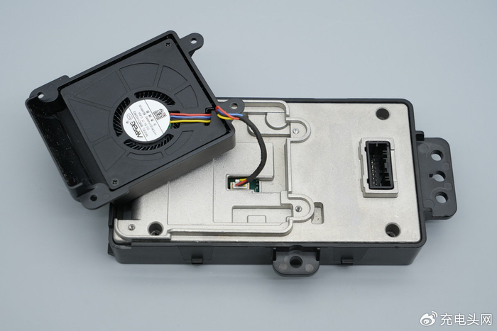 智己汽车前装无线充电模块采用铝合金后盖,通过螺丝固定,并设有散热风扇。