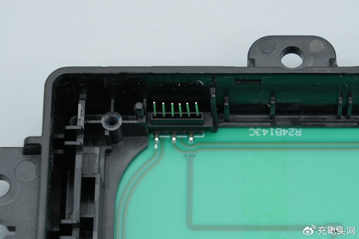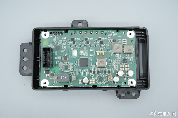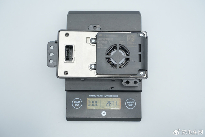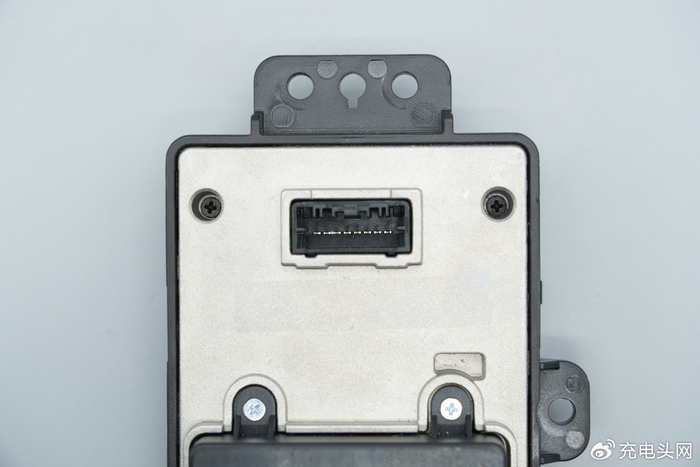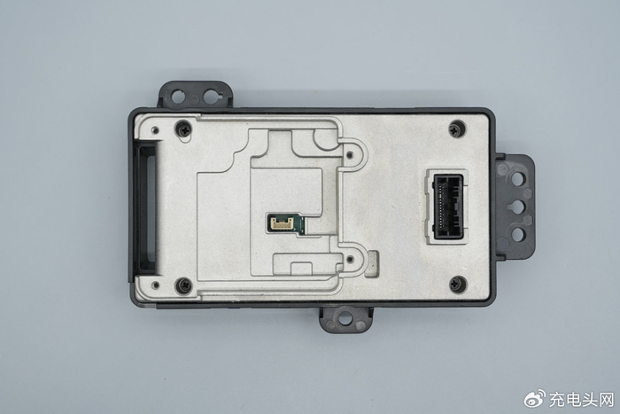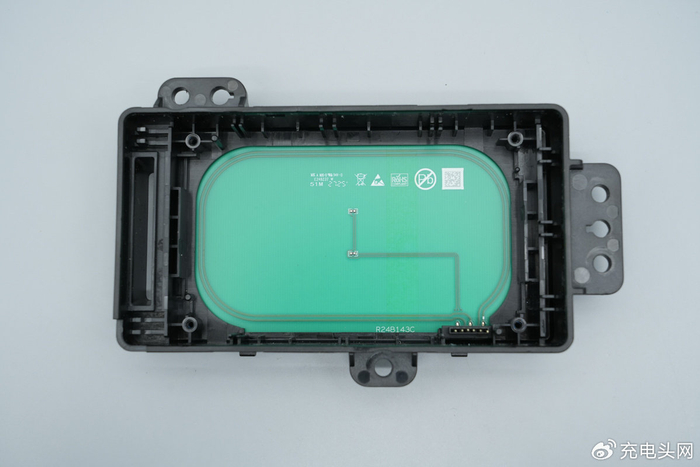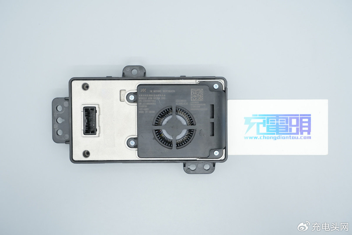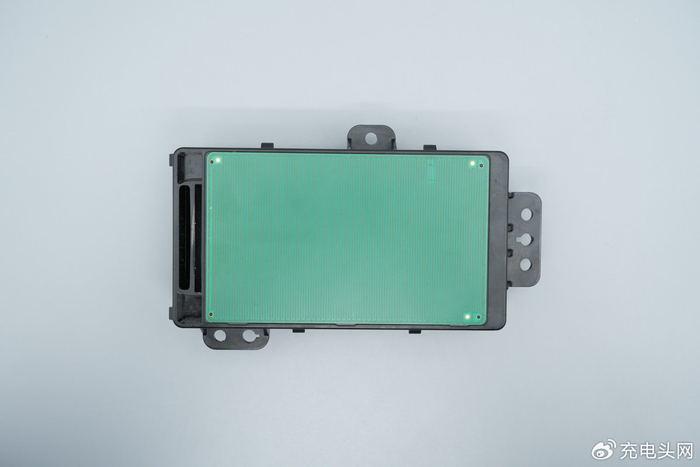 充电头网淘到了智己50W车载前装无线充电模块,这款模块内置NFC功能,设有PCB屏蔽面板,安装在装饰面板下方。模块设有一个充电位置,背面采用铝合金外壳,并设有散热风扇,由底部吹出空气为手机和无线充电器散热。