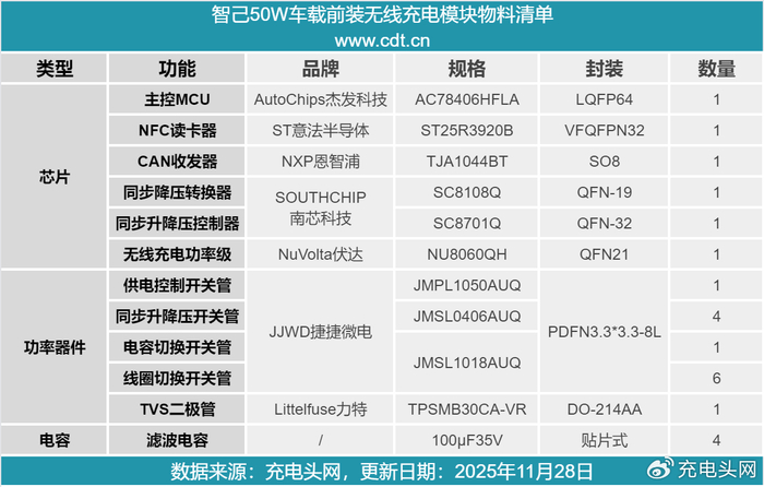 最后附上智己50W车载前装无线充电模块的核心器件清单,方便大家查阅。