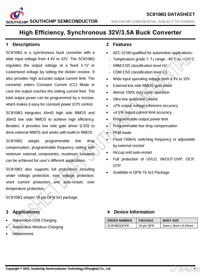 同步降压芯片来自南芯科技,型号SC8108Q,是一颗汽车级同步降压转换器,符合AEC-Q100 Grade 1标准,芯片支持4.4-32V输入电压,输出电流3.5A,芯片内部集成45mΩ上管和30mΩ下官,支持驱动外置NMOS。芯片具备可编程的线损补偿,开关频率可编程,支持欠压保护,过压保护,短路保护和过热保护,采用QFN-19封装。
