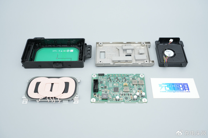 无线充电器通过内置风扇加快空气流通,带走大功率无线充电产生的热量,带来更加快速的无线充电体验,将碎片化时间充分利用。下面就带来智己50W车载前装无线充电模块的拆解,一起看看内部的方案和用料。