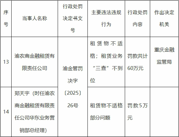 国家金融监督管理总局 网站近日发布的重庆监管局行政处罚信息公开表(渝金管罚决字〔2025〕26号)显示, 渝农商金融租赁 有限责任公司租赁物不适格、租赁业务“三查”不到位,重庆金融监管局对其罚款共计60万元。