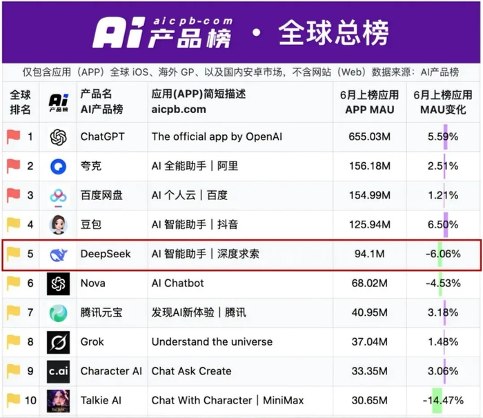 6月AI产品榜发布,DeepSeek排名从榜首滑落至第五,月活用户骤降至9410万,首次出现-6.06%的负增长。网页端表现更糟,月访问量连续四个月下跌,平均每月降幅达9.63%,6月访问量仅3.8亿,较年初峰值缩水近三成。