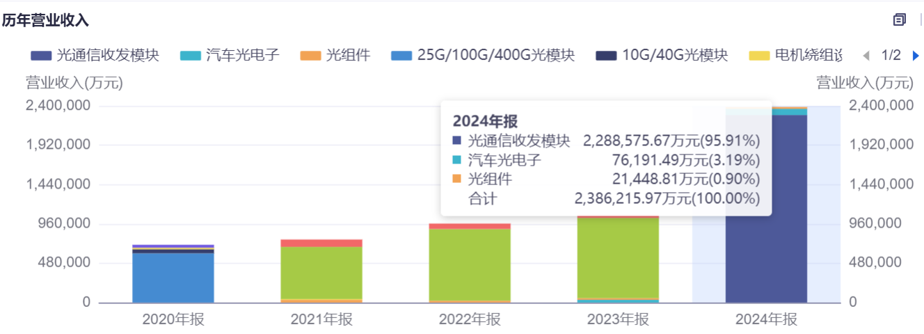 早在2020年, 中际旭创 就在业内率先推出800G可插拔光模块,领先竞争对手一年。2024年营收占比中,光通信收发模块占比高达95%以上,其中800G等高端产品是绝对主力。