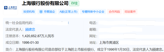 天眼查显示,上海银行成立于1996年1月30日,目前注册资本约为142亿元,法定代表人是顾建忠,他也是该行的董事长。