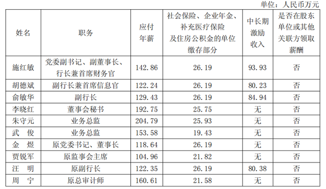 同样有着中长期激励收入的,还有副行长兼首席信息官胡德斌,薪酬为228.66万元;副行长俞敏华,薪酬为240.56万元;原副行长汪明,薪酬为228.92万元。