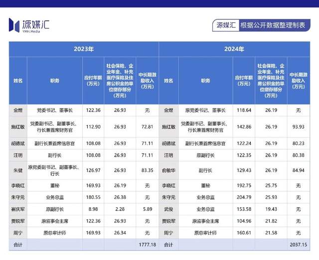整个2024年,上海银行高管薪酬合计为2037.15万元,较2023年的1777.18万元增加259.97万元,同比增长14.63%。