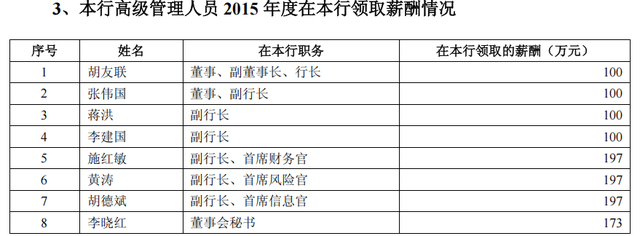 在上市前的2015年,上海银行的高管年薪普遍在百万元以下。例如董事长金煜的薪酬是111万元,行长胡友联为100万元,副行长施红敏为197万元,董秘李晓红为173万元。