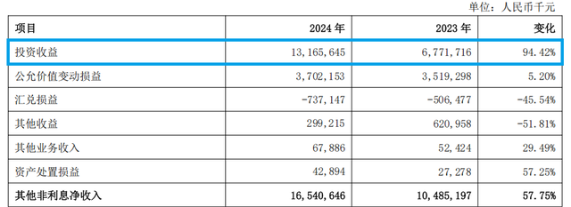 而推动上海银行2024年营收增长的动力,既不是来自传统业务——“利息净收入”,也不是非息收入中的“手续费及佣金净收入”,而是来自131.66亿元的“投资收益”——同比增长94.42%。