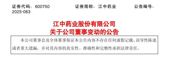 同日,江中药业发布高管人员任职变动公告:因工作调整,董事胡凤祥先生、崔兴品先生及邓蓉女士已提交辞职报告。其中,胡凤祥先生的辞职自董事会收到报告之日起生效;崔兴品先生和邓蓉女士的辞职将在股东大会选举产生新任董事后生效。