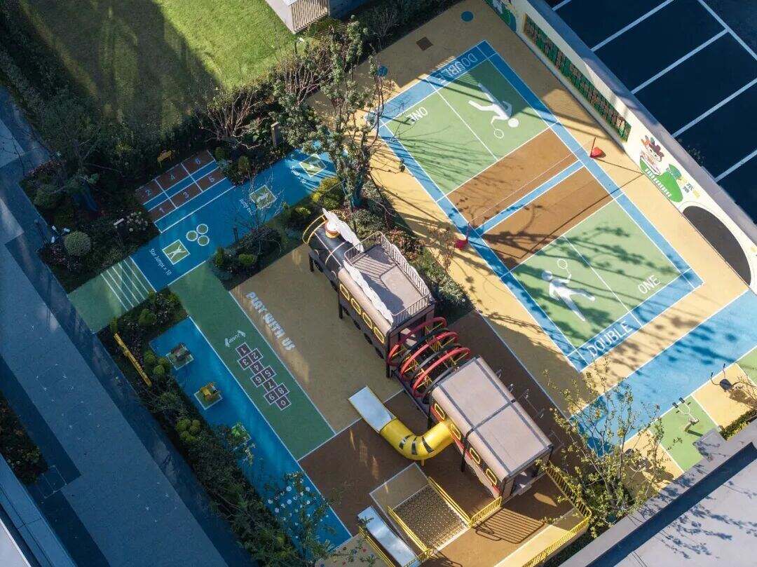 行至开阔处,湛蓝的露天泳池如宝石般镶嵌在绿意之中。整个园林的设计注重实用与互动,供邻里小聚的休闲平台、孩子们奔跑嬉戏的阳光草坪、长者悠然漫步的健康步道……这些空间有机地串联起来,共同构成了园区共享的“第二客厅”。