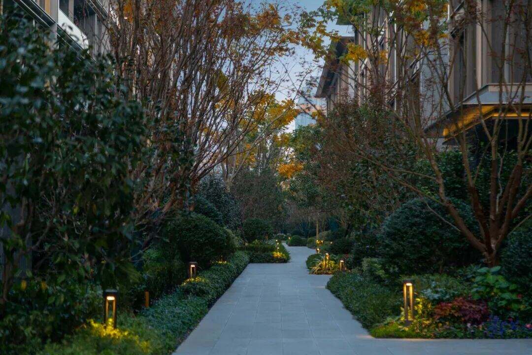 归家的体验始于细节。从兼具仪式感与辨识度的主入口门厅,走进安静的园区小径,两旁树木成荫,自然滤去了城市背景的喧嚣。景观水系沿路延伸,潺潺水声轻柔,自带舒缓情绪的伴奏。