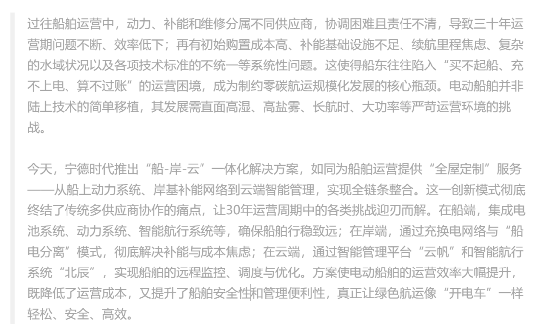 简单说就是现在的船舶行业主要使用的是传统化石能源,这里面就容易有一个问题,造发动机和加油的以及维修的是不同的公司,一旦船使用出问题了,就很容易出现协调困难和责任分不清楚的问题,导致船的运营效率低下(当然了,宁德时代这里肯定是过分夸大了,一个船出了什么问题其实还是很好定位的,并没有这么离谱)。
