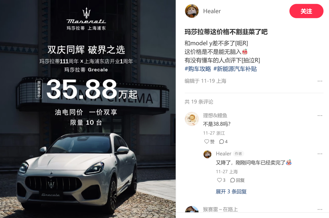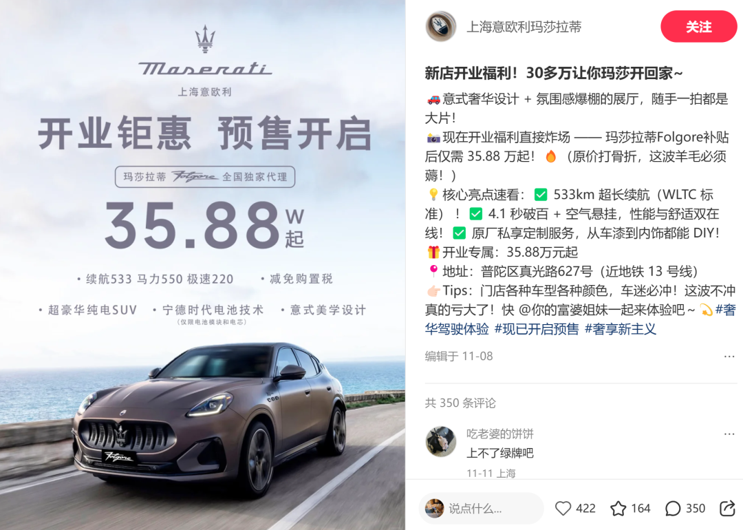 据经销商透露,此次特价车均为新店开业的特批现车资源,全国仅百余台配额,其中七八十台特价车短时间内已售出半数,上海门店出现“早8点排队、晚9点才下班”的抢购盛况,部分外地客户更是跨省订车,低配车型短短一个周末便宣告售罄。需要注意的是,35.88万元为基础裸车价,加上必要选配后落地价约40万元,但即便如此,对于承载着无数人豪华梦的玛莎拉蒂而言,这样的价格依然具备颠覆性吸引力。