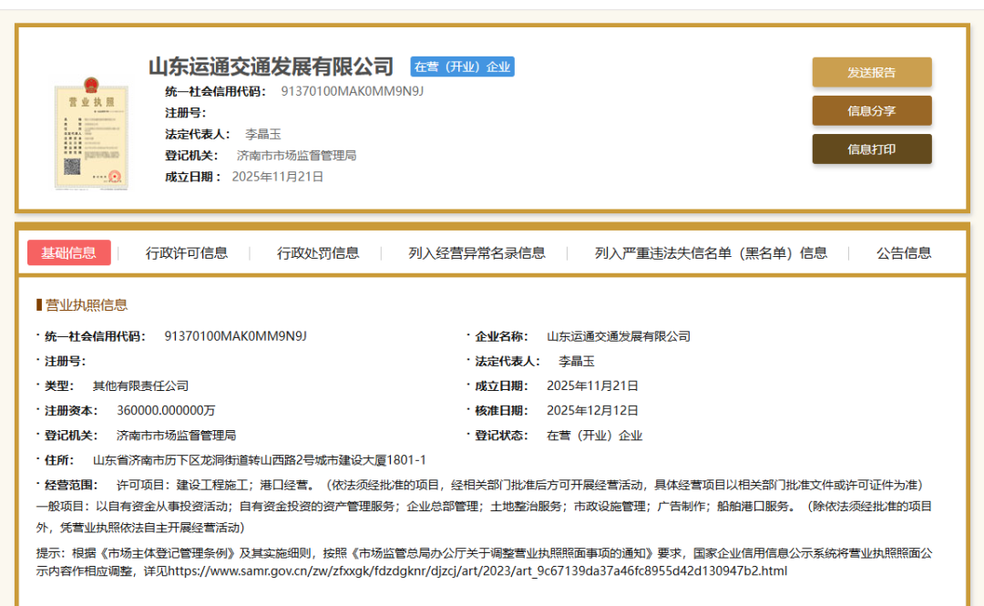 工商信息显示,山东运交成立于2025年11月,注册地址位于济南市历下区,经营范围包括建设工程施工,港口经营,以自有资金从事投资活动,自有资金投资的资产管理服务,企业总部管理,土地整治服务,市政设施管理,船舶港口服务等。