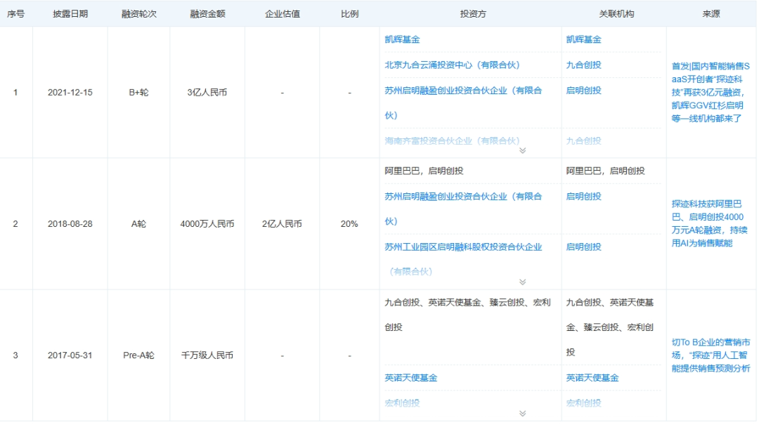 信息显示,探迹科技成立之后曾有过3次公开融资,累计融资约5亿元,其资方包含 阿里巴巴 、 红杉中国 、九合创投、 启明创投 等明星机构的身影。