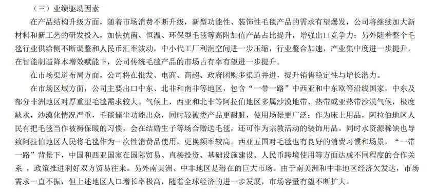 然而,由于主要销售阵地在海外,这些年 真爱美家 的业绩出现了不小的波动。2023、2024年, 真爱美家 营业收入分别为9.53亿元、8.79亿元,分别同比下降2.64%、7.77%。对厚重型毛毯有巨大需求的中东和非洲,是 真爱美家 的主要市场; 真爱美家 曾在财报中表示,在地缘政治等背景下,全球供应链调整,“部分纺织产能继续向东南亚(越南、印度、孟加拉)和北非(埃及、摩洛哥)转移,国内企业面临东南亚低成本竞争及贸易壁垒压力。”
