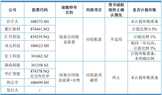 由上表可知, 信宇人 、 紫江新材 、 汇兴智造 等公司持有“迪链”均以获取合同现金流为目标,故将“迪链”列报为应收账款,且按照不同方式来计提坏账准备,其中 信宇人 未计提坏账准备;而 湖南裕能 、 华汇智能 、 利元亨 等公司持有“迪链”既以收取合同现金流量为目的又以出售为目标,故将“迪链”分类为以公允价值计量且其变动计入其他综合收益的金融资产,列报为应收款项融资,且均未计提坏账准备;公司持有“迪链”目的既以收取合同现金流量为目的又以出售为目标,故将“迪链”作为应收款项融资列报,未计提坏账准备。